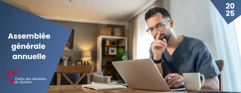 Les dentistes qui souhaitent y assister et participer au vote doivent s’inscrire. Quelques jours avant l’AGA du 20 novembre, un courriel contenant le lien pour se joindre à distance sera envoyé aux dentistes inscrits.