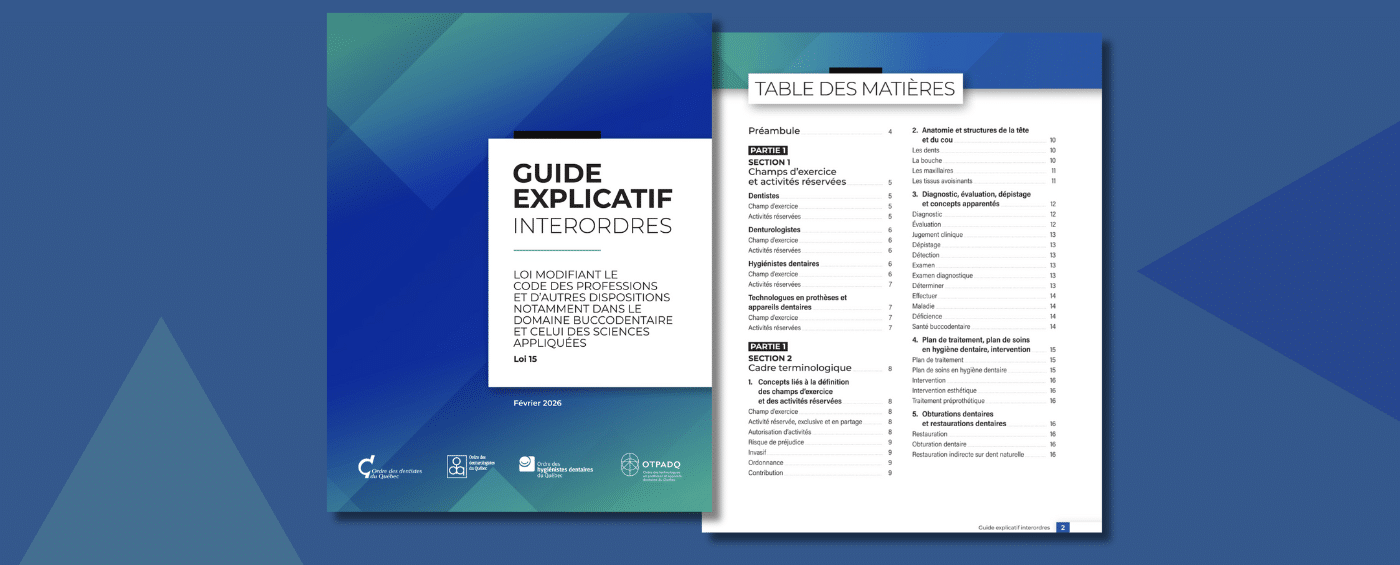 Élaboré conjointement par l’Ordre des dentistes du Québec, l’Ordre des denturologistes du Québec, l’Ordre des hygiénistes dentaires du Québec et l’Ordre des technologues en prothèses et appareils dentaires du Québec, ce document vise à offrir une clarification cohérente et harmonisée des champs d’exercice et des activités réservées.