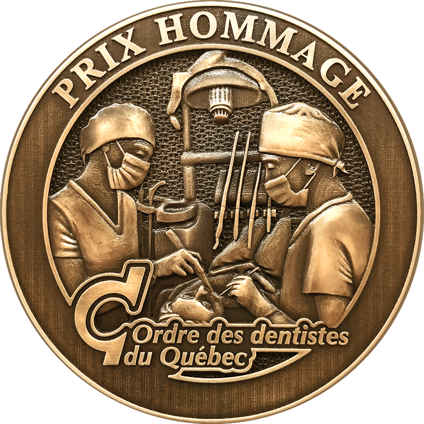 Remis depuis 2007, le Prix Hommage de l’Ordre des dentistes du Québec vise à reconnaître l’apport exceptionnel d’un de ses membres au développement de la profession, en lien avec le mandat de promotion de la santé buccodentaire et de protection du public de l’Ordre. Le récipiendaire reçoit une oeuvre d’art en verre soufflé qui évoque les différents matériaux utilisés en dentisterie, dont l’or, la porcelaine et le titane, et qui symbolise l’avenir et l’excellence.